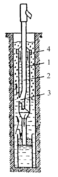 Воздушно-водяная смесь из смесителя 3 проходит в затрубное пространство и поднимается вверх, а ее место заполняется промывочной жидкостью, поступающей от забоя.