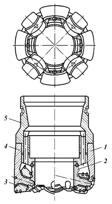 Рис. 2.7. Схема устройства бурильной головки дробящего действия типа ТКЗ: 1 – накладка на внутреннюю шарошку; 2 – внутренняя секция с цапфой; 3 – шарошка; 4 – наружная секция; 5 – муфта с присоединительной резьбой.