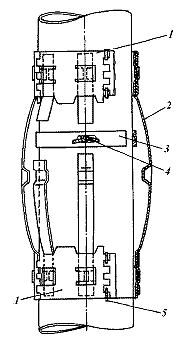 Рис. 5.20. Центратор пружинный типа ЦЦ для обсадных труб: 1 – петля сегментная; 2 – планка пружинная (рессора); 3 – кольцо стопорное; 4 – клин витой (ключ); 5 – ось Центратор типа ЦЦ одевается на обсадную трубу и состоит из сегментной петли 1, пружинных планок (рессор) 2, стопорного кольца 3, ключа 4 и оси 5. Основные параметры пружинных центраторов типов ЦЦ и ЦЦ-Т приведены в табл. 5.12 и 5.13, а типа ЦПН в табл. 5.14.
