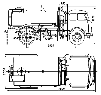 Рис. 6.21. Нефтепромысловая автоцистерна АЦН-7,5-5334: 1 - цистерна; 2 - установка искрогасителя; 3 - установка фары и тахометра; 4 - автошасси МАЗ-5334; 5 - система самовсасывания; 6 - насосный блок; 7 - манифольд; 8 - огнетушитель ОУ-2