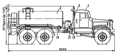 Рис. 6.22. Нефтепромысловые автоцистерны ЦР-7АП и ЦР-7АПС: 1 - автошасси КрАЗ-255Б; 2 - всасывающее устройство; 3 - цистерна; 4 - манифольд; 5 - центробежный насос 4НКЭ-5Х1 в блоке с редуктором-ускорителем; 6 - редуктор