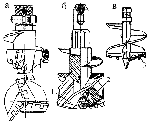 шарошечно-резцовое; в — короткошнековый бур; 1 — лопасть-резец; 2 — шарошка; 3 —