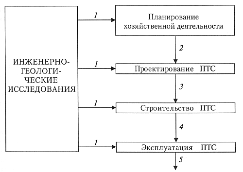 Инженерно-геологические работы занимают определенное место в процессе деятельности человека. Для выявления положения инженерно-геологических изысканий в системе процессов планирования, проектирования, строительства и эксплуатации природно-технических систем (ПТС) следует обратиться к исходным данным, на основании которых эти процессы осуществляют. Проектирование ПТС в наиболее явном виде связано с инженерно-геологическими работами. Проектирование требует исходной информации. Информация, используемая на разных стадиях проектирования ПТС, делится на: