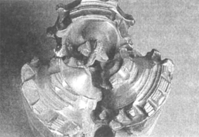 BU (сальникообразование) (рис. 9.5). Долото с сальником на шарошках характеризуется износом зубьев,  вызванным проскальзыванием одной или нескольких шарошек вследствие забивания породы между ними.
