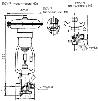 Выпускаются с проходным корпусом (условное обозначение ПОУ-7, исполнение I) и с угловым корпусом (условное обозначение ПОУ-10, исполнение 1). Устанавливаются на горизонтальном трубопроводе вертикально, приводом вверх. Присоединяются к трубопроводу при помощи резьбовых муфт с внутренней конической трубной резьбой по ГОСТ 12717—67. Пропускная характеристика линейная. Полный ход плунжера происходит при изменении командного давления воздуха от 0,02 до 0,1 МПа.