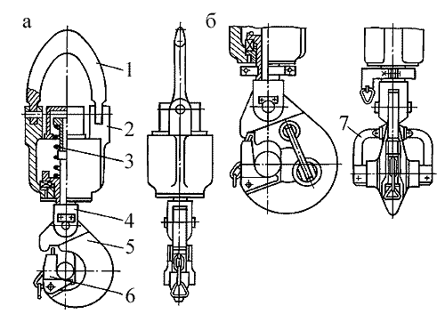 серьга; 2 - корпус крюка; 3 - пружина; 4 - ствол