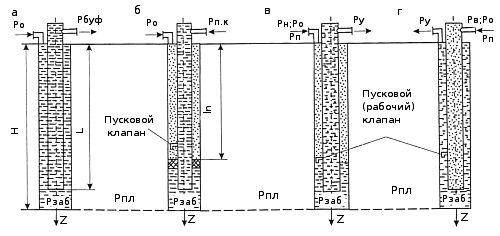 Рис.20.2. Конструкция однорядных лифтовых колонн без пакера (а), с пакером (б), а также кольцевая (в) и центральная (г) системы