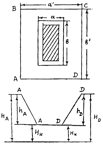 где Рк = ab — площадь дна котлована, Р'к = a'b' на уровне физческой поверхности, hK — средняя глубина котлована, определяемая по формуле