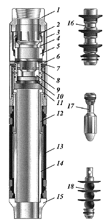 Рис. 11.7. Заколонный гидравлический пакер типа ПДМ для ступенчатого и манжетного цементирования скважин:1 — переводник верхний; 2 — втулка защитная; 3 — корпус патрубка; 4 — седло верхнее; 5 — втулка верхняя; 6 — отверстие циркуляционное; 7 — винт срезной; 8 — втулка нижняя (верхняя); 9 — седло нижнее; 10 — кольцо упорное; 11 — канал корпуса впускной; 12 — канал осевой; 13 — уплотнитель рукавный; 14 — патрубок уплотнителя; 15 — переводник нижний; 16 — пробка запорная; 17 — пробка падающая; 18 — пробка продавочная.