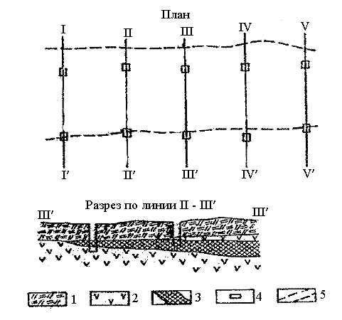 В обоих случаях расстояние между линиями канав или шурфов определяется исходя из протяженности залежи по простиранию, предполагаемой степени изменчивости формы, условий залегания, качества полезного ископаемого. Обычно на стадии детальных поисков тело полезного ископаемого пересекают 3-4 линиями выработок.