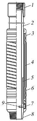 Рис. 11.5. Пакер типа ПЗГ: 1 — муфта обсадной колонны; 2 — корпус; 3 — подвижный обжимной стакан; 4 — уплотнительный элемент; 5 — канал для подвода жидкости; 6 — неподвижный обжимной стакан; 7 — узел клапанный; 8 — резьба обсадных труб; 9 — полый срезной штифт.