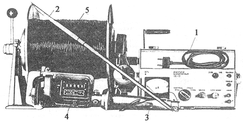 1 - пульт; 2 - скважинный ориентатор; 3 - устройство для поверки; 4 - счетчик глубины; 5 - лебедка.