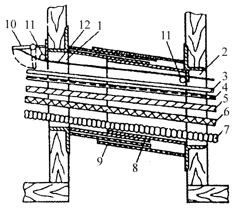 При отрицательных температурах с целью предотвращения замерзания раствора ПАВ и ГЖС в шлангах всасывающей и нагнетательной магистралей между люками 1 НКД и 2 бурового здания устанавливают специальный телескопический фанерный кожух 8, обеспечивающий соединение люков, находящихся на разных уровнях и смещенных по оси. На телескопический кожух 8 надевается брезентовый рукав 9, предохраняющий от атмосферных осадков и потерь тепла. В КНБ постоянно поддерживается положительная температура, при работе компрессора вентилятор обеспечивает интенсивное перемещение теплого воздуха по телескопическому кожуху.