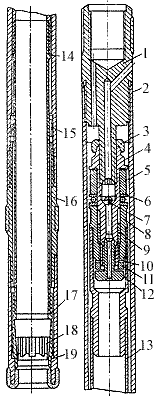 Подшипниковый узел состоит из верхнего переходника 1, соединенного резьбами с наружной трубой 2 и корпусом 4, в котором размещается сигнализатор самоподклинивания керна, упорный подшипник 6 и соединительная муфта. К муфте на резьбе присоединяется внутренняя керноприемная труба 13, в нижней части соединенная с рвательным устройством. К наружной трубе через алмазный или твердосплавный расширитель 16 крепится специальная алмазная коронка 19, снабженная пакерным поясом.