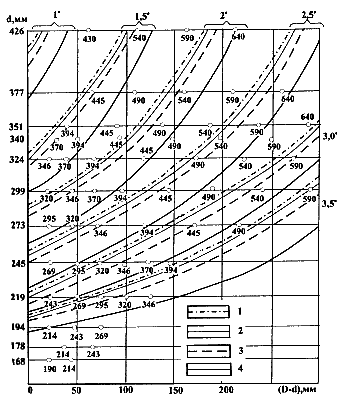 Рис. 11.1. График для определения диаметра скважин под обсадную колонну (с учетом кривизны ствола): 1-sinαср=0,05; 2-sinαср=0.1; 3-sinαср=0,2; 4-sinαср=0,4