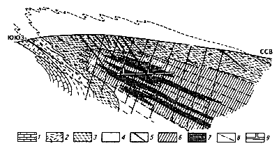 Рис.110. Поперечный разрез зоны прожилково-вкрапленной золото-сульфидной минерализации, сопровождающейся золотоносными кварцевыми жилами месторождения Сухой Лог (по В. А. Буряку) 1 — известковистые алевролиты и алевросланцы; 2 — алевросланцы и алевролиты, преимущественно грубозернистые; 3 — «углистые» филлитовидные алевролиты; 4 — углистые кварцево-серицитовые алевросланцы; 5 — кварцевые жилы; 6, 7 — ореол развития золото-сульфидной минерализации: 6 — умеренной, 7 — повышенной; 8 — кливаж; 9 — подземные горные выработки |