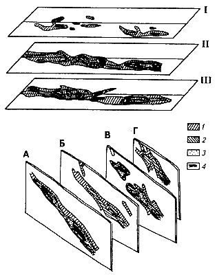 По падению рудное тело прослежено на 1,5 км. Оно имеет раздувы и пережимы, а распределение золота в нем носит столбовый характер (рис. 111). Расположение рудных столбов контролируется общим простиранием рудного тела, поперечными разрывными нарушениями и участками изгибов залегания пород в рудовмещающей зоне. Рудные столбы имеют неправильную форму, вытянутую вдоль секущих разрывов. Рис. 111. Распределение золота на месторождении Сухой Лог по горизонтам I, II, III и разведочным разрезам А, Б, В, Г (по данным геолого-разведочных работ) 1—4 — содержания: 1 — фоновое, 2 — удвоенное фоновое, 3 — утроенное фоновое, 4 — свыше утроенного фонового Кроме главного рудного тела выявлена группа слабозолотоносных кварцевых жил более позднего возраста. Они формировались преимущественно выше прожилково-вкрапленных руд. Цитологический контроль оруденения выражается в приуроченности прожилково-вкрапленных руд к горизонтам пород с повышенным содержанием углеродистого вещества и сульфидов осадочного и метаморфического происхождения. |