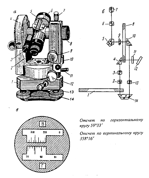 а. Устройство Т-30: 1 — подставка; 2, 3 — окулярные кольца окуляра и отсчетного микроскопа; 4 — вертикальный круг; 5 — зрительная труба; 6 — визир; 7 — закрепительный винт трубы; 8 — кремальера; 9 — наводящий винт трубы; 10 — цилиндрический уровень; 11,12 — закрепительный и наводящий винты алидады; 13 — закрепительный винт лимба; 14 — подъемный винт;