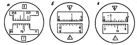 Рис. 1.79. Поле зрения отсчетного устройства теодолита: а — ТЗО; б— 2Т30 при положительном угле наклона; в — 2Т30 при отрицательном угле наклона
