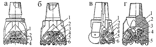 рабочий конус шарошек; 6 - усиленная калибрующая поверхность