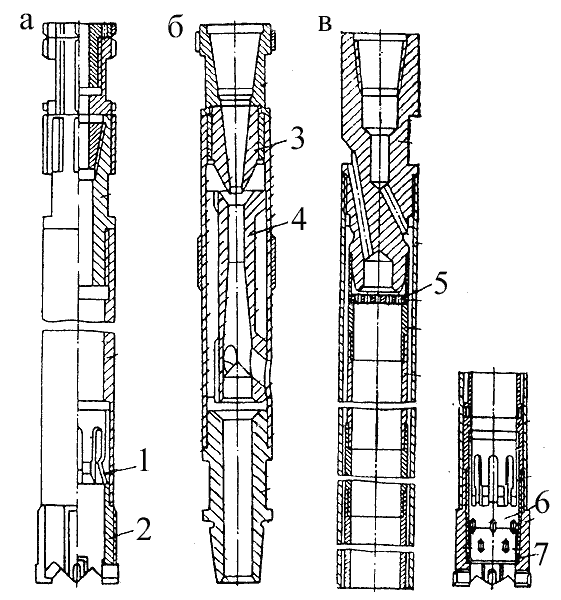 а — колонковый набор ОК-81; б — эжекторный узел ОК-80М-76; в — двойной колонковый набор ОК-70М. 1 — кернорватель; 2 — коронка КГ-3-76-4; 3 — сопло; 4 —. диффузор; 5 — щелевой фильтр;6 — корпус кернорвателя; 7 — резиновое кольцо.